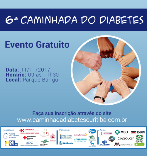 No dia 11 de novembro de 2017, acontecerá em Curitiba a 6ª Caminhada do Diabetes. O evento tem como objetivo chamar a atenção da sociedade para o cuidado do Diabetes e faz parte do calendário das comemorações do Dia Mundial do Diabetes. Nesse ano, o tema será a Mulher e o Diabetes e várias ações serão realizadas com o objetivo de informar a todos sobre o assunto.
