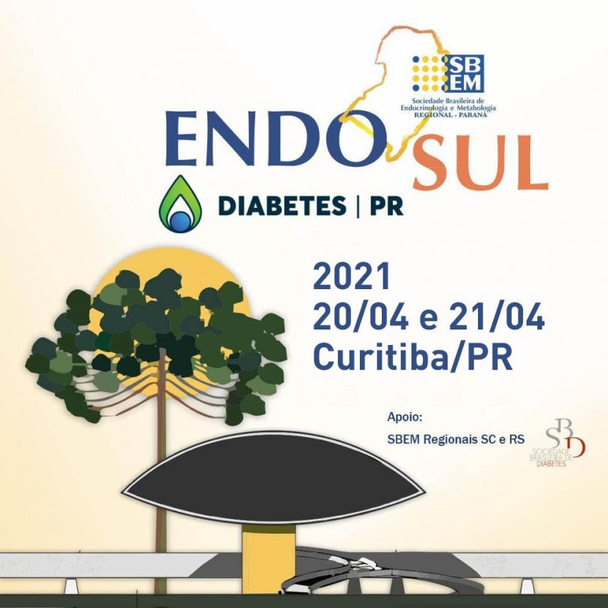 O evento Endosul & Diabetes PR, que tem o apoio das regionais SBEMSC e SBEMRS e da Sociedade Brasileira de Diabetes, será realizado nos dias 20 e 21 de abril de 2021, e devido à pandemia da Covid-19 será totalmente online.