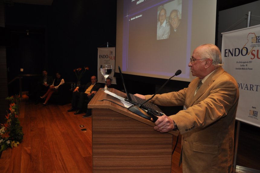“Este momento é muito especial para mim”, disse o endocrinologista Edgard Niclewicz ao agradecer a homenagem da SBEM-PR. Citou nominalmente cada pessoa que contribuiu para sua formação como homem e médico: pai, mentores, professores, colegas de profissão e família. Fez questão de focar seu pronunciamento aos jovens médicos presentes no EndoSul 2017, observando que “sente um descrédito sobre o médico e a medicina, mas temos que lutar contra isso, porque nosso papel é muito importante. Nossa profissão é gloriosa, compensadora Os médicos ajudam a quem sofre, são grandes humanistas”, assinala.