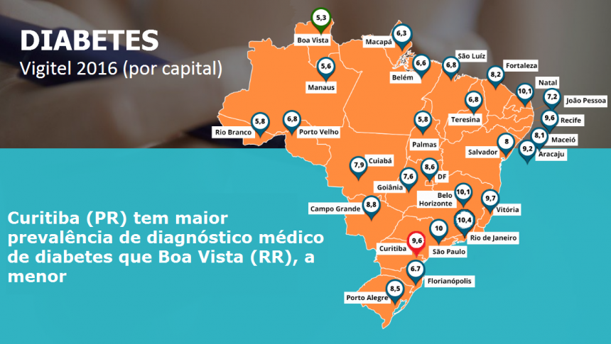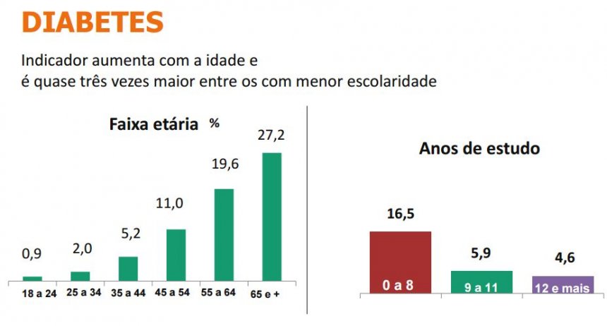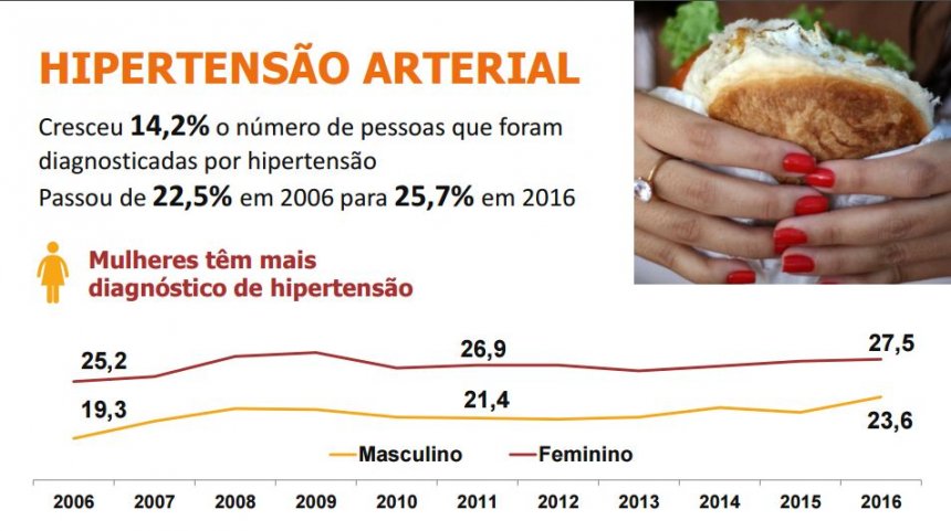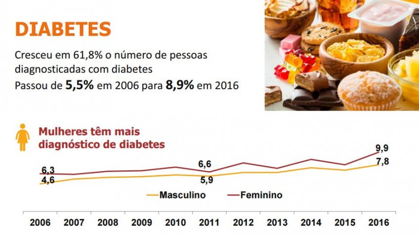 - O diagnóstico médico de diabetes passou de 5,5% em 2006 para 8,9% em 2016 e o de hipertensão de 22,5% em 2006 para 25,7% em 2016.