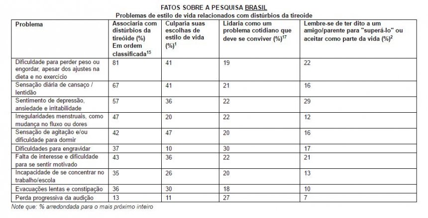 A pesquisa no Brasil também mostrou que a maioria associa sintomas como dificuldade para ganhar ou perder peso (81,4%), ou estar cansado ou lento (67,2%) com um distúrbio da tireoide, mas poucos estavam cientes de que os distúrbios da tireoide podem estar relacionado a outros sintomas, como a capacidade de concentração (34,9%) ou falta de interesse e dificuldade para se sentir motivado (43%), ansiedade e irritabilidade. Esses números embasam os resultados que concluem que 36% dos entrevistados no Brasil julgam o fato de sentir-se deprimidos, ansiosos e irritáveis como uma consequência de suas próprias escolhas de estilo de vida.