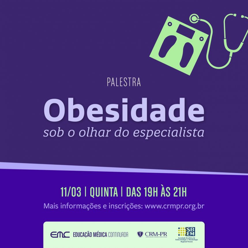 A Sociedade Brasileira de Endocrinologia - Regional Paraná (SBEM-PR) e o Conselho Regional de Medicina do Paraná (CRM-PR) convidam médicos, estudantes de Medicina e demais interessados para a palestra "Obesidade sob o olhar do Especialista", que será realizada na quinta-feira, 11 de março, das 19h às 21h.