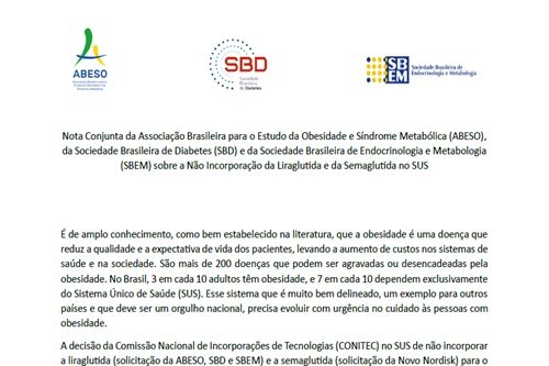 Nota Conjunta ABESO, SBD e SBEM sobre a não incorporação da Liraglutida e da Semaglutida no SUS