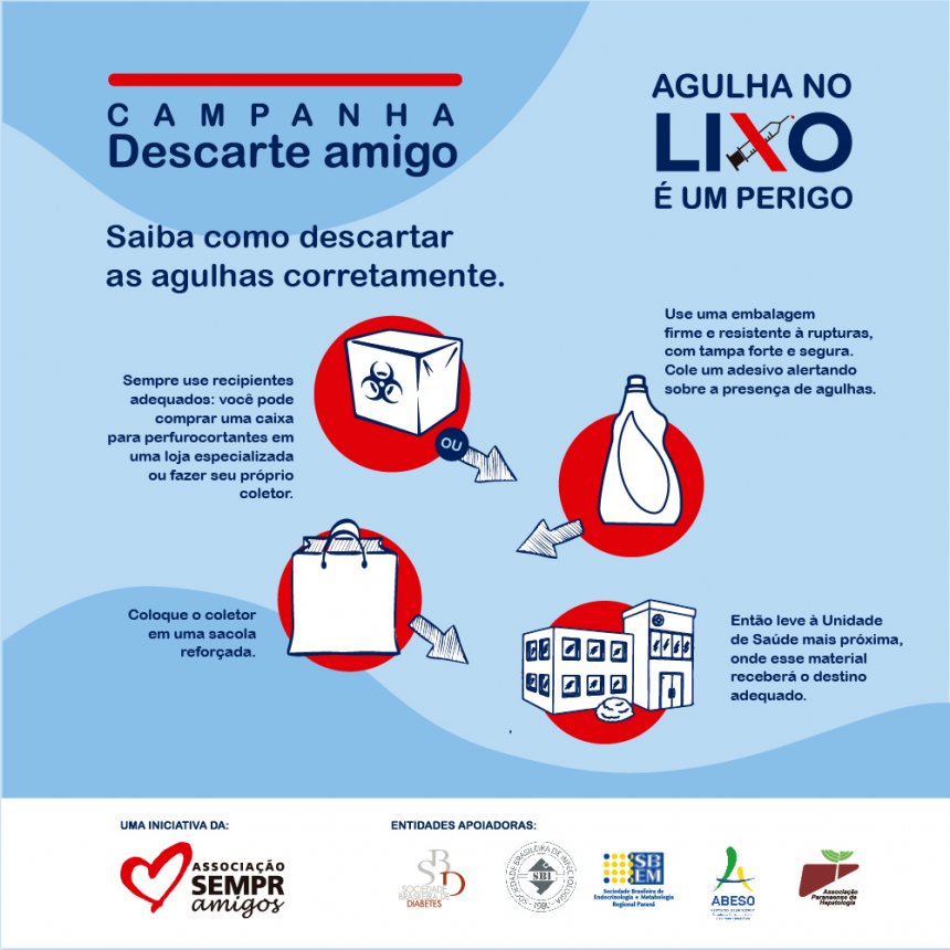Para alertar a população sobre os cuidados necessários, a Associação SEMPR Amigos, com o apoio da Sociedade Brasileira de Infectologia (SBI), Sociedade Brasileira de Diabetes (SBD), Sociedade Brasileira de Endocrinologia Regional Paraná (SBEM-PR), Associação Paranaense de Hepatologia (APH) e Associação Brasileira para o Estudo da Obesidade e da Síndrome Metabólica (ABESO), criou a campanha pública “Agulha no lixo é um perigo”.
