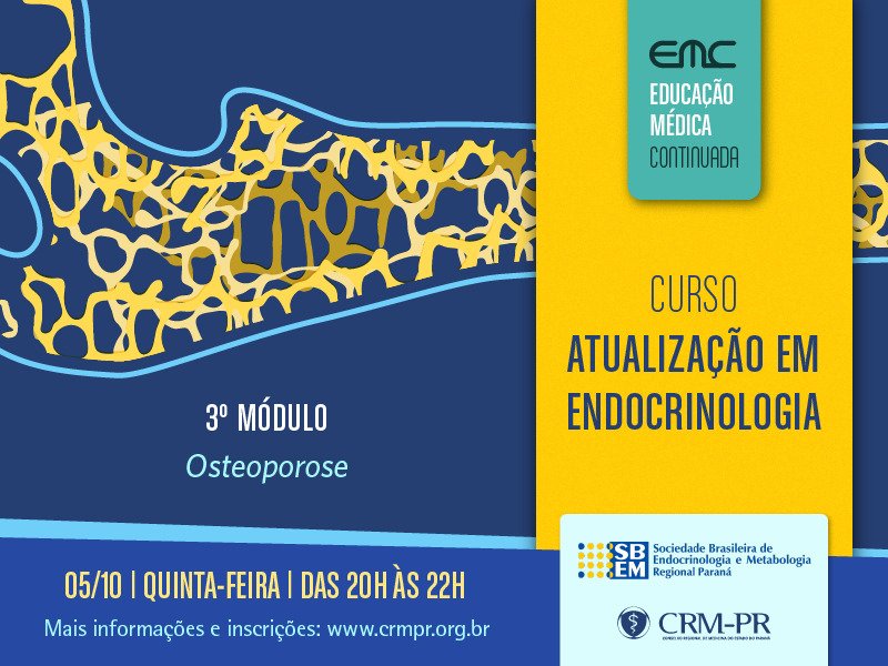 No dia 5 de outubro o Conselho Regional de Medicina do Paraná, por meio do Projeto de Educação Médica Continuada, em parceria com a Sociedade Brasileira de Endocrinologia e Metabologia – Regional Paraná, promovem o 3º módulo do curso de atualização em Endocrinologia e o tema será "OSTEOPOROSE".