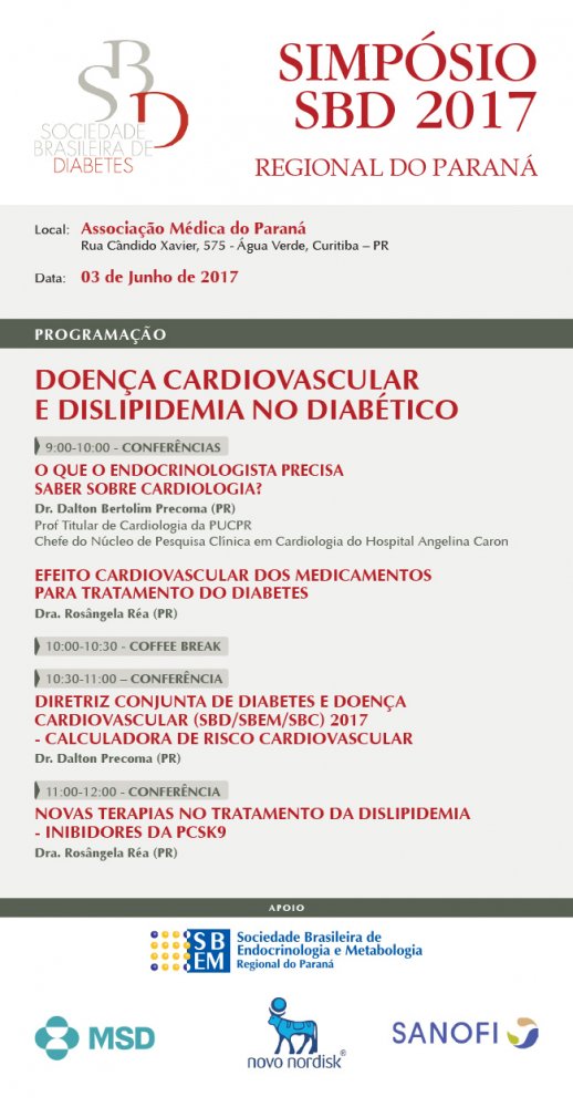 O tema do Simpósio da SBD 2017 é Doença Cardiovascular e Dislipidemia no Diabético. O cardiologista Dr. Dalton Bertolim Précoma, chefe do núcleo de pesquisa clínica do Hospital Angelina Caron abre os trabalhos a partir das 9 horas com a palestra "O que o endocrinologista precisa em cardiologia?". Logo após, a partir das 10h, está previsto o tema "O efeito cardiovascular dos medicamentos para tratamento do diabetes", ministrado pela endocrinologista Dra. Rosângela Réa.